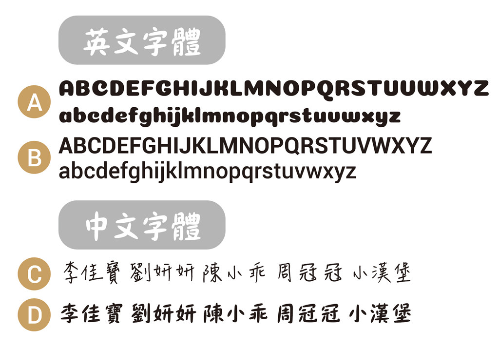 ❤客製化中英文名字,實際文字大小依字數多寡按比例調整。