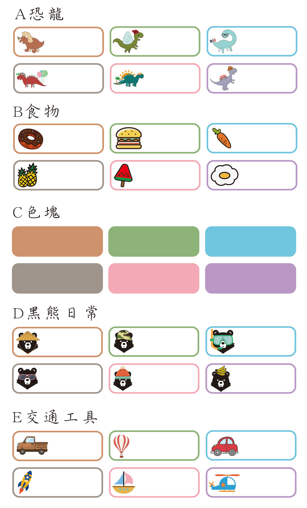 ▼5種系列圖案選擇,恐龍、食物、色塊、黑熊日常、交通工具▼