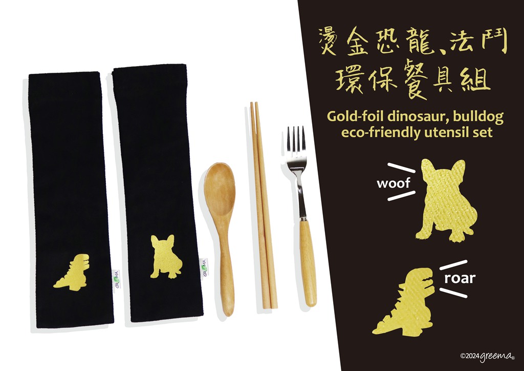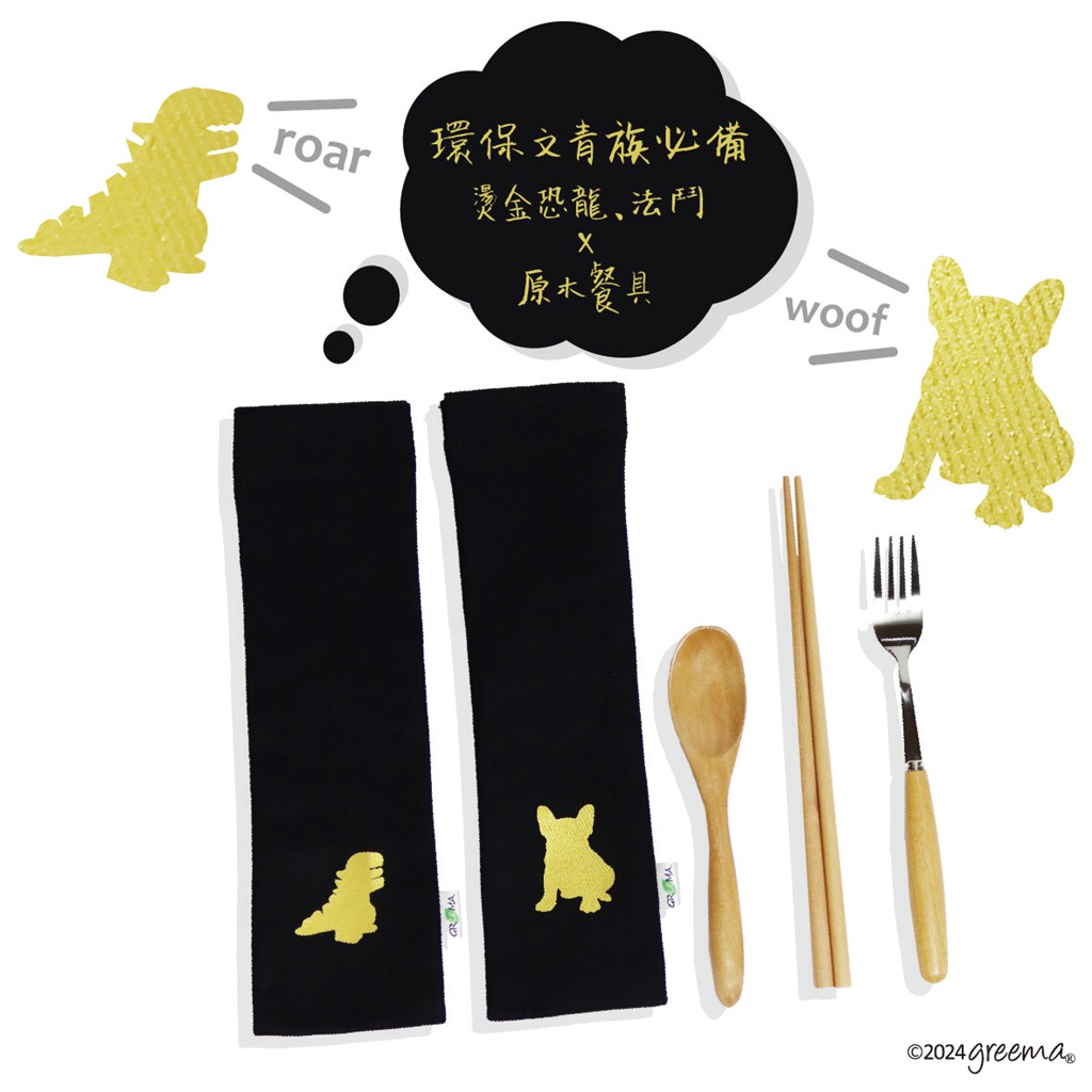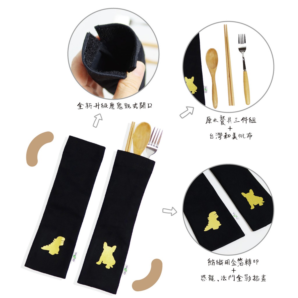 環保餐具 魔鬼氈式收納帆布袋 燙金 恐龍 法鬥 可選購餐具